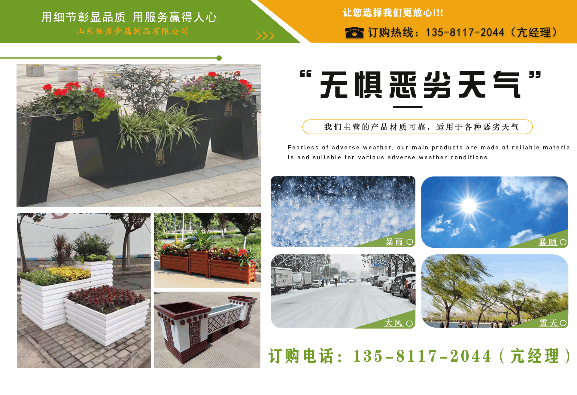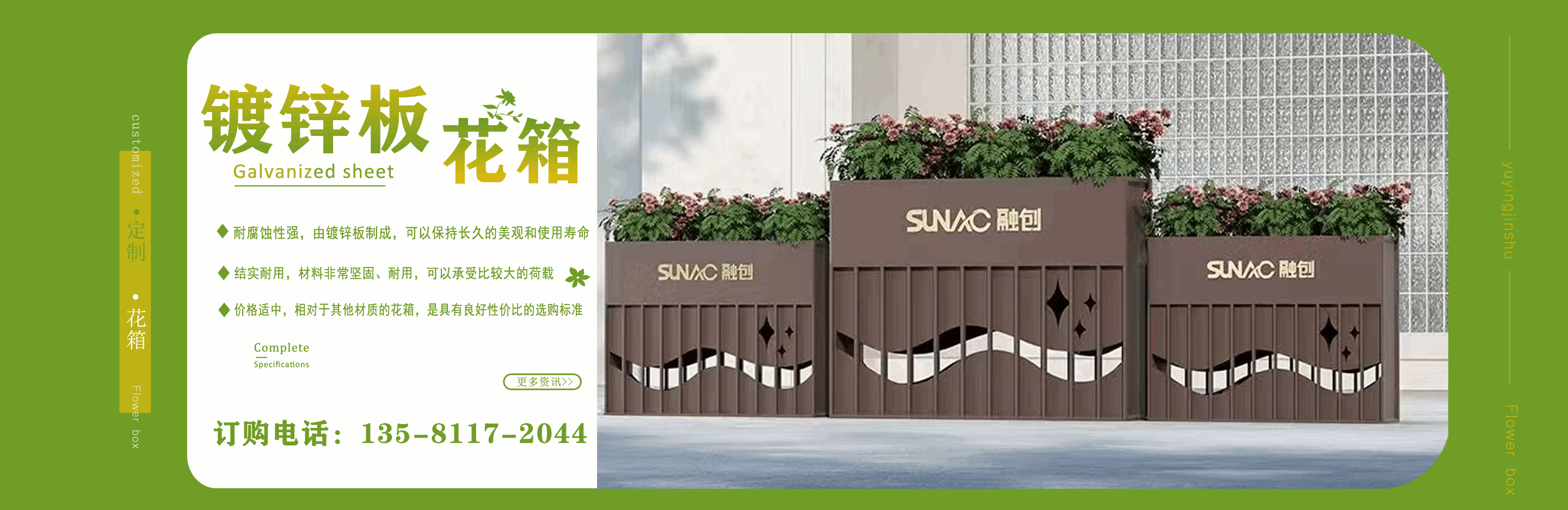 山東鈺盈金屬制品有限公司主營(yíng)鍍鋅板花箱,道路隔斷花箱,定制花箱,戶(hù)外道路花箱,花箱座椅等產(chǎn)品,產(chǎn)品結(jié)構(gòu)合理、性能優(yōu)良,具有強(qiáng)度高、耐腐蝕、抗老化、隔熱隔音、節(jié)約能源、外形美觀、使用壽命長(zhǎng)等優(yōu)點(diǎn),深受?chē)?guó)內(nèi)外客戶(hù)認(rèn)可。 我們根據(jù)客戶(hù)所在城市的文化特征,制造出符合當(dāng)?shù)爻鞘形幕瘹庀⒌淖匀涣Ⅲw、觀賞性強(qiáng)的花箱產(chǎn)品成為城市里一道靚麗的風(fēng)景線(xiàn)。 公司實(shí)行誠(chéng)實(shí)、公正、守信、價(jià)格合理、平等互利。 公司憑借雄厚經(jīng)驗(yàn)實(shí)力,恪守誠(chéng)信為本的原則,得到了眾多客戶(hù)的信賴(lài),并在業(yè)界獲得良好的口碑。建立了穩(wěn)固的合作關(guān)系,隨著業(yè)務(wù)的不斷發(fā)展和壯大,合作伙伴的范圍也在不斷擴(kuò)大。我們熱情盼望與您的合作,為社會(huì)的可持續(xù)發(fā)展獻(xiàn)上一份努力。...